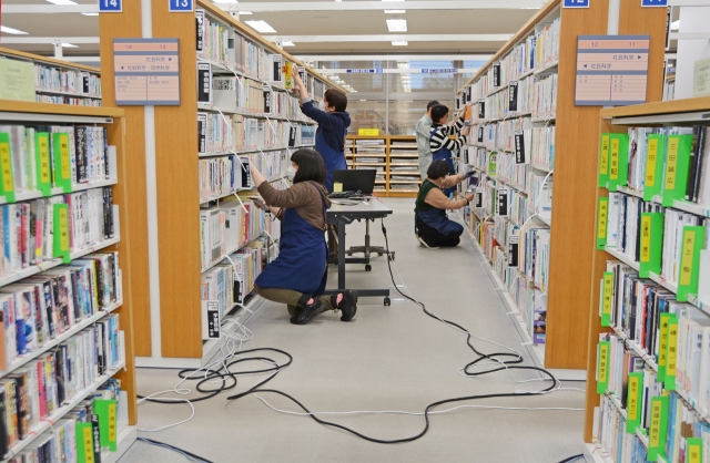特別整理休館中のソフィアセンター。端末機器を使って蔵書を点検する職員たち (2017/02/17)
