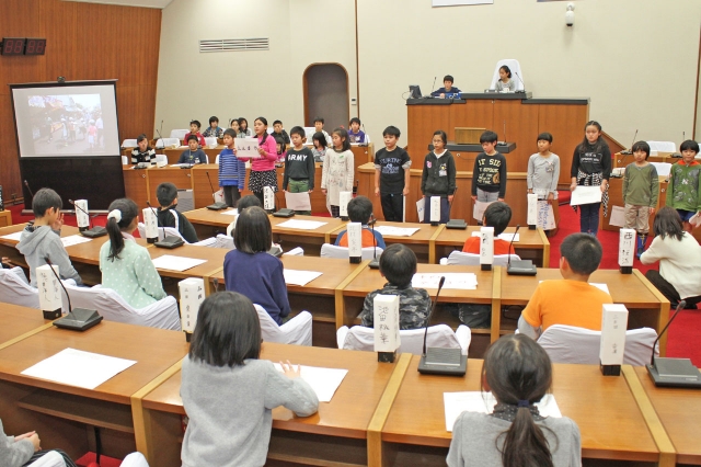 柏崎の活性化などへ提案を発表した柏崎小4年生=17日、市議会議場 (2017/02/18)