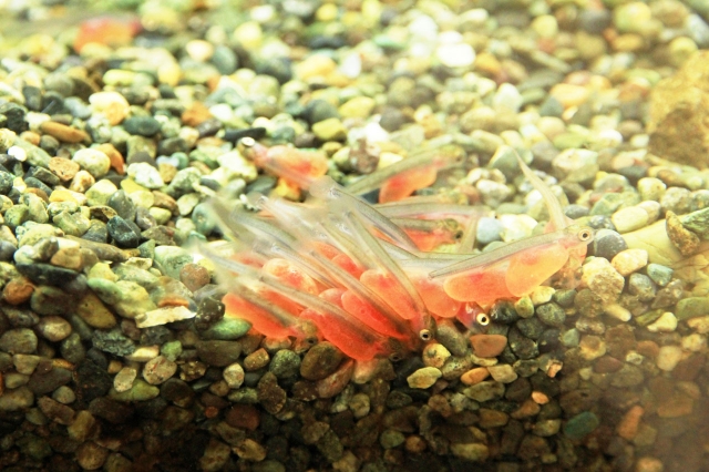 オレンジ色の栄養袋をおなかにつけたサケの赤ちゃん=市内青海川、柏崎さけのふるさと公園 (2016/12/21)