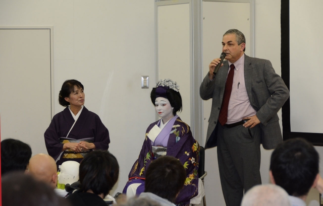 「忠臣蔵」をテーマに講演をするコミンズ教授(右)と歌舞伎の衣装を着けた女子学生=22日、産大  (2016/12/24)