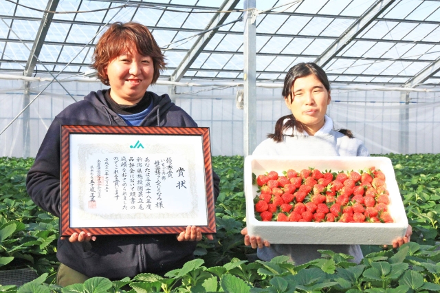 品評会入賞の賞状を手にするファームくじらなみのスタッフ。品質、収量、衛生管理の良さが高く評価された (2016/12/27)