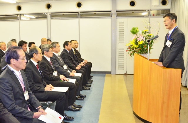 市職員に年頭のあいさつを述べる桜井市長=4日朝、市役所大会議室 (2017/01/04)