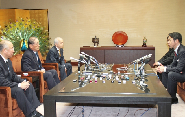 米山知事(右)と面談する東電の数土文夫会長(左中央)、広瀬社長(同奥)ら=5日午前、県庁特別応接室 (2017/01/05)