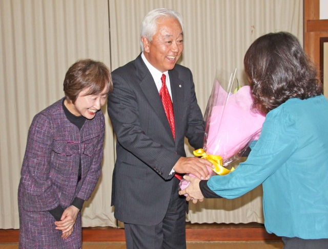 当選祝いの花束を受け取る品田宏夫氏。左は薫子夫人=15日午後6時過ぎ、上高町集落開発センター (2016/11/16)