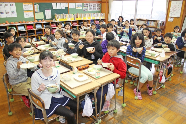 柏崎の旬の野菜などを使った地場産給食デーの献立を味わう児童たち=17日、比角小 (2016/11/18)