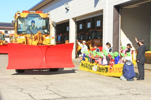 保育園児の激励を受け、次々と出発する除雪車=18日午後、市内藤元町の市除雪基地 (2016/11/19)