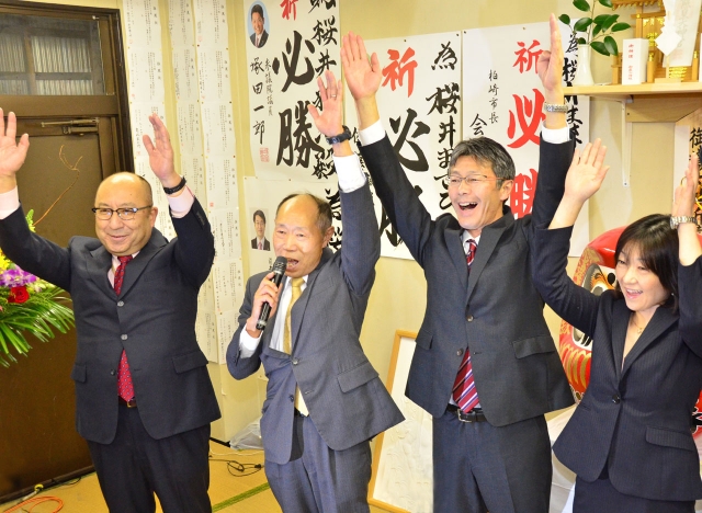 市長選当確となり、喜びの万歳をする桜井雅浩さん(右から2人目)=20日午後8時過ぎ、市内豊町の選挙事務所 (2016/11/21)