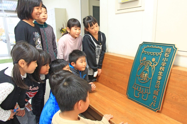 新しい「鯖石橋」の歩道側高欄に取り付けられる「鯖カッパ」のレリーフ板。文字と絵が金色に輝き、児童は目を見張った (2016/11/24)