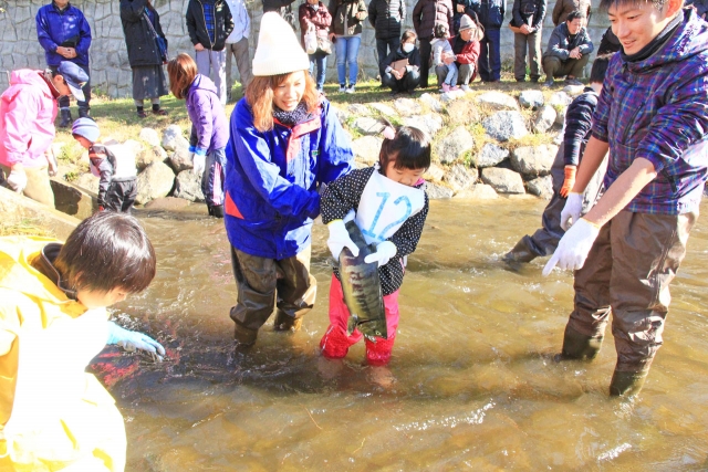 豊漁まつりで大きなサケを捕まえ、池から引き上げる参加者=柏崎さけのふるさと公園 (2016/11/26)