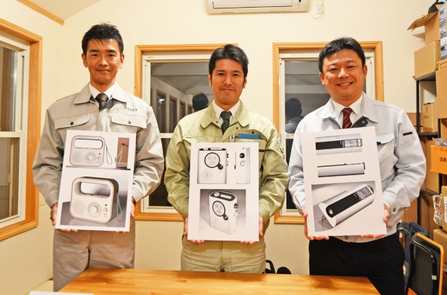 市の次期防災情報伝達システムへの参画を目指し、専用ラジオを独自開発した竹内代表(中央)らAKKのメンバー=25日夜、市内東本町2 (2016/10/27)