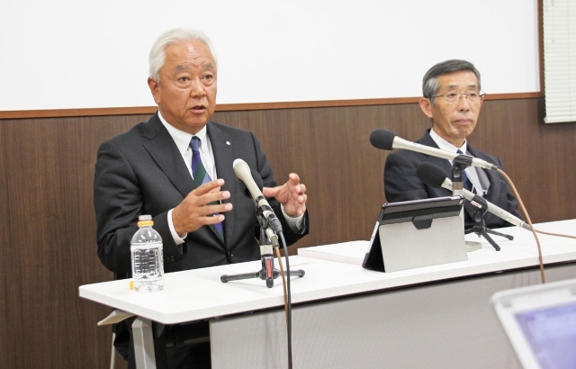 5選出馬を正式に表明した品田村長(左)=1日午前、刈羽村役場多目的室 (2016/11/01)