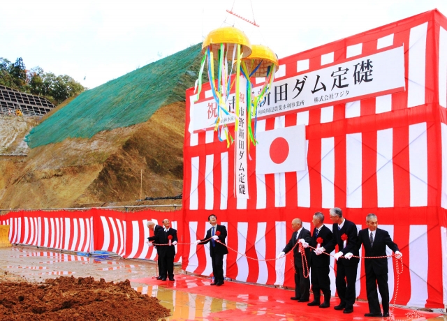 鵜川地区の人たちの手でくす玉が割られた市野新田ダムの定礎式 (2016/11/04)