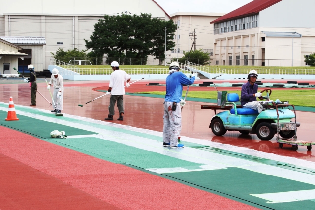 ローラーを使ってトラックのエンボス加工を行う工事関係者=市陸上競技場 (2016/08/27)
