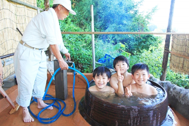 和紙の原料を煮る大釜でつくった五右衛門風呂を楽しむ新渡戸文化小の児童 (2016/09/01)