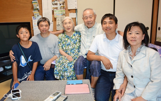 再会の喜びにわく三井田さん(右から3人目)とビンさん(同2人目)、リーさん(左から2人目)=市内比角1