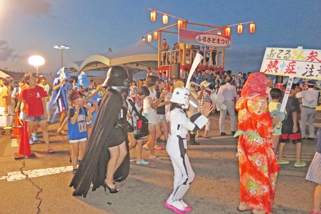 刈羽甚句の盆踊り大会。工夫を凝らした仮装の参加者=15日、ラピカ駐車場 (2016/08/19)