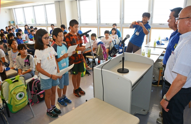 なぎさ体験塾で宣誓を行う東村山、小平、柏崎市の小学生=19日、シーユース雷音 (2016/08/20)