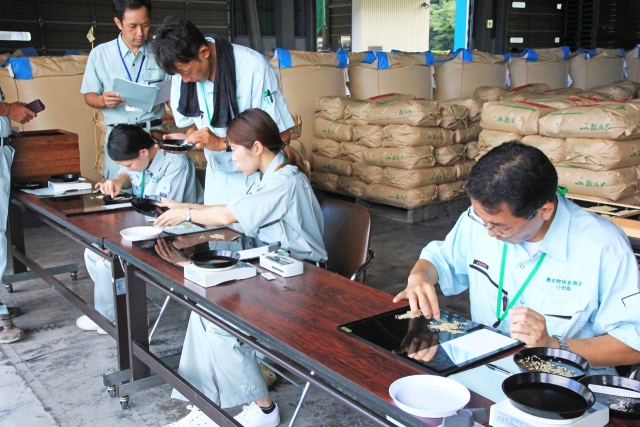 天候に恵まれ、適期の栽培管理で全量が1等に格付けされた早期栽培越路早生の初検査=市内平井、柏崎農協ライスターミナル (2016/08/22)