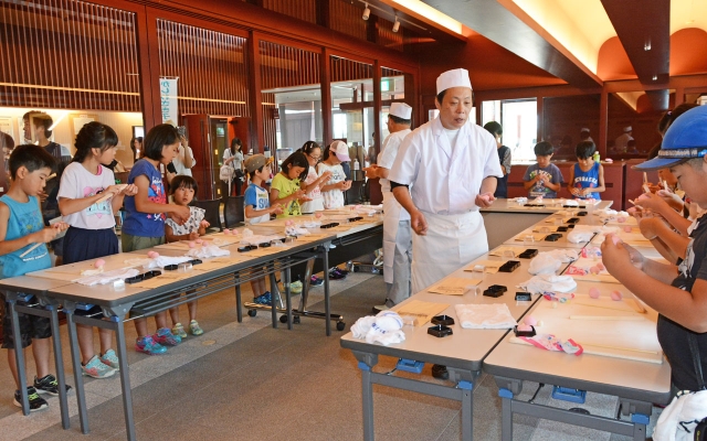 屋内外に30のブースが並んだ「小学生のお仕事体験塾」。和菓子職人の技も学んだ=アルフォーレ (2016/08/23)
