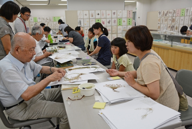 苦心の作品を前に、講師の指導を受けた名前調べ会=20日、ソフィアセンター