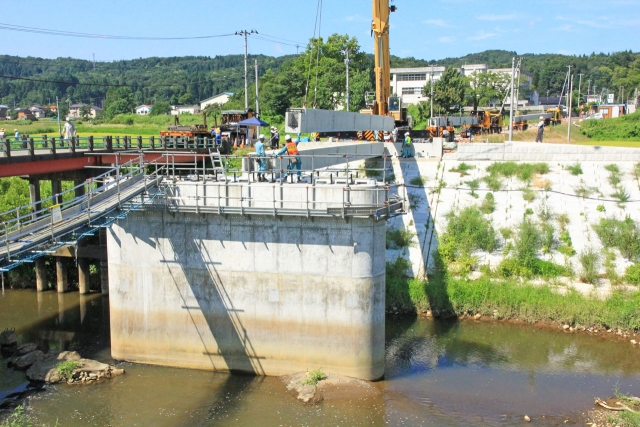 中鯖石地区待望の「鯖石橋」架橋作業。左が現在の「鯖石橋」、対岸の白い建物が鯖石小校舎=25日、鯖石川右岸の善根側から撮影