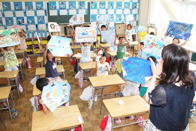 夏休み明け最初の授業で、担任教諭に工作などの宿題を見せる児童たち=26日、柏崎小 (2016/08/26)