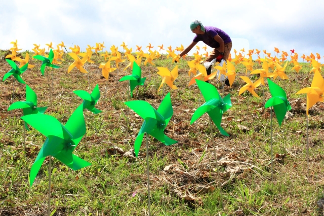 広いゲレンデに飾られたたくさんの風車=市内高柳町岡野町、ガルルのスキー場 (2016/08/04)
