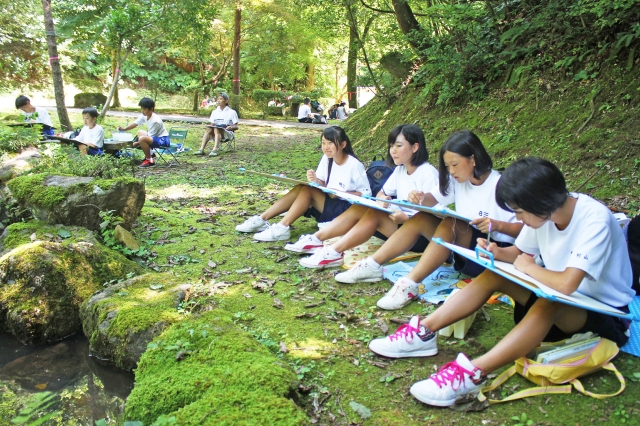 小・中学生夏休み写生大会で絵筆を走らせる参加者=赤坂山公園 (2016/08/06)