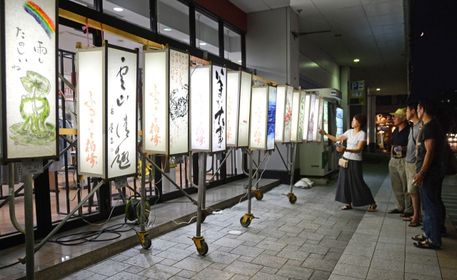 ずらりと並ぶ絵あんどん作品に見入る人たち=6日午後7時半ごろ、市内東本町1 (2016/08/08)