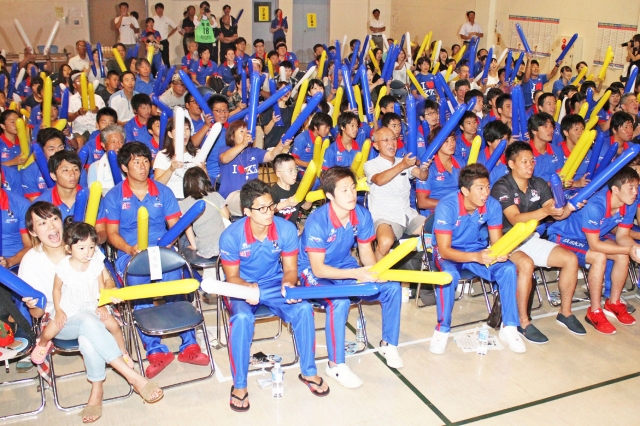 リオ五輪水球競技日本―ブラジル戦のPV。市民ら200人が集まり、日本代表に声援を送った=9日午前8時過ぎ、中央地区コミセン (2016/08/09)