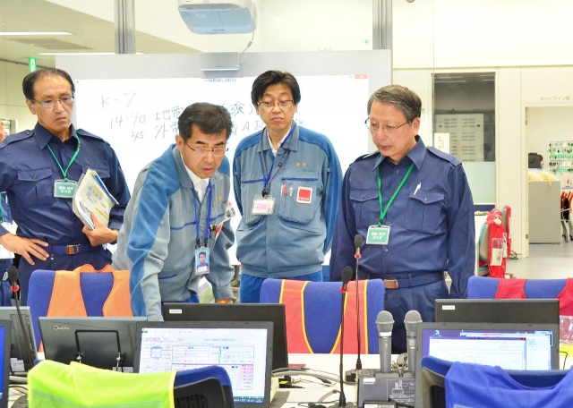免震重要棟に整備されたガラス張りの本部室内を見る会田市長(右)=9日午後、柏崎刈羽原発 (2016/08/10)