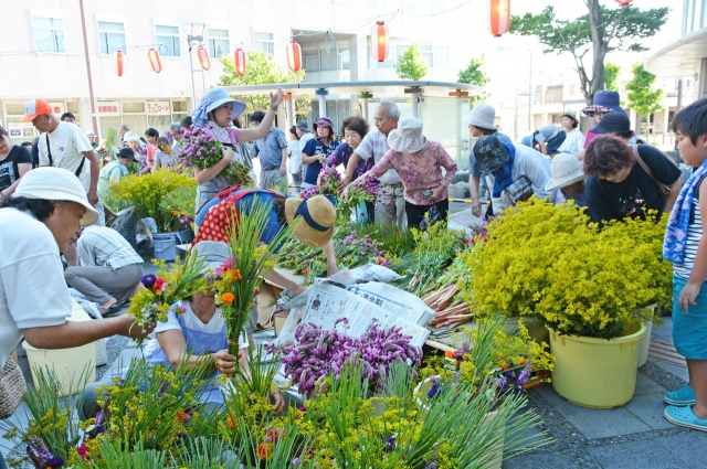 お盆を前にしてにぎわった伝統の花市=11日午後4時過ぎ、市民プラザ前 (2016/08/12)