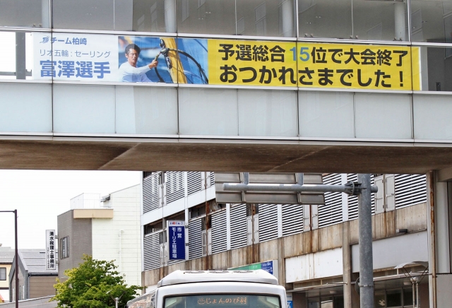 市民プラザ渡り廊下に張り出された富沢選手の五輪活躍をたたえる横断幕 (2016/08/13)