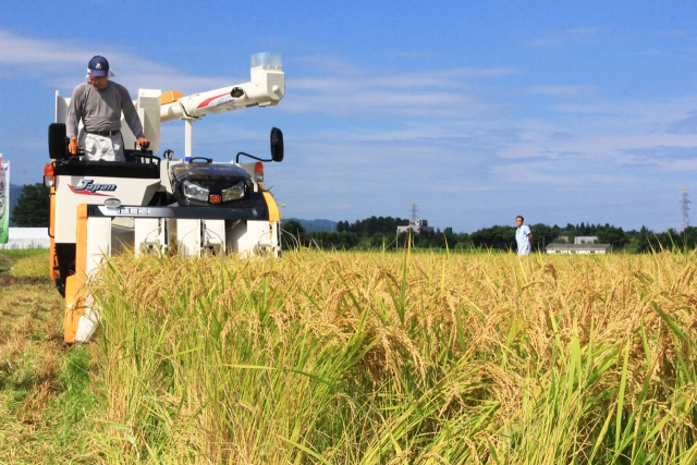 県内で一番早い新米出荷を目指し、早期栽培した越路早生の稲刈り。高品質などに期待がかかる=16日、市内藤井 (2016/08/16)