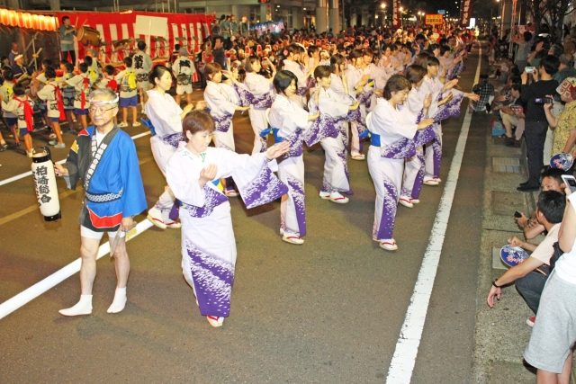 踊り絵巻で市民の元気を示した民謡街頭流し=24日夜、市内東本町1