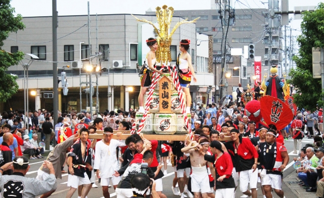 市民の心意気をアピールした「たる仁和賀」。威勢のよいもみ合い、バラエティー豊かな山車で楽しませた=25日夜、市内東本町1