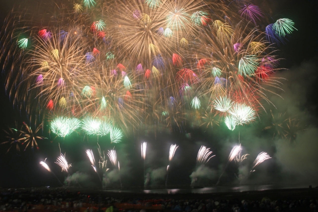 光と音の“響宴”で楽しませた海の大花火大会=26日夜、市内中央海岸
