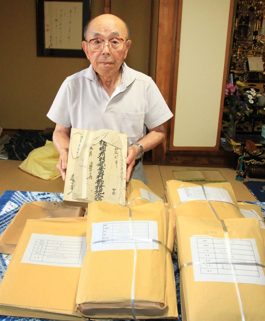 「大字安田の書庫」に保管されていた古文書を手にする藤巻泰男さん