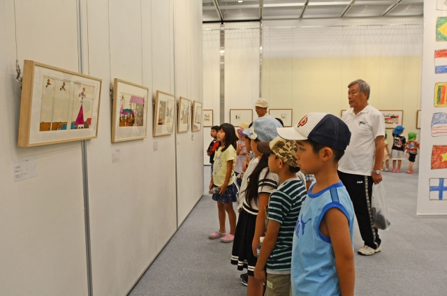 ソフィアセンター開館20周年記念の五味太郎作品展で、ずらりと並ぶ原画を見る子どもたち=30日午前