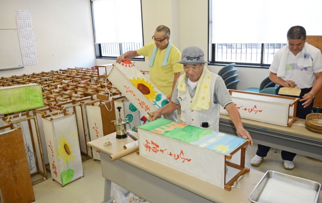市内外から寄せられた作品をあんどんに仕立てる作業=1日午前、フォンジェ2階
