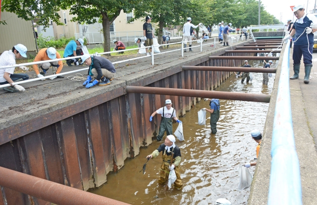地域、企業などから200人が参加し、よしやぶ川の一層の環境整備を目指した「川さらい」 (2016/08/02)