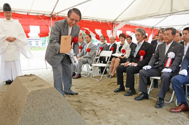 五中校舎改築工事の安全祈願祭でくわ入れを行う会田市長=2日午前、市内宮平 (2016/07/02)