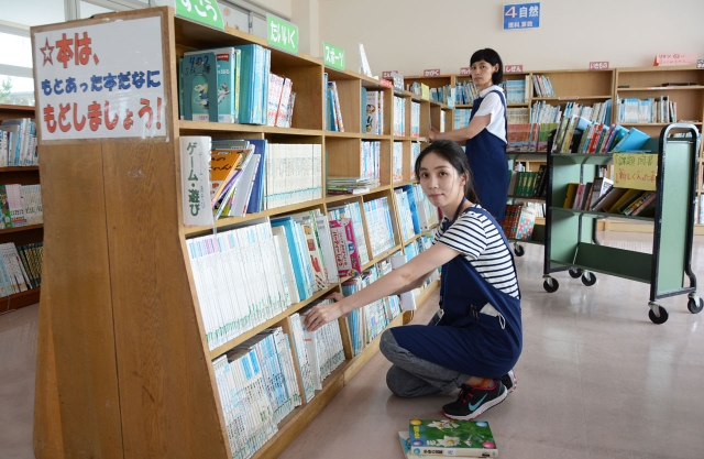 今月から市内小学校で図書の整理など本格的な活動に取り組む読書支援員の太田さん(手前)と菅野さん=柏崎小図書室 (2016/07/06)