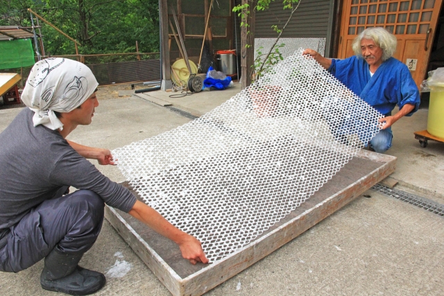 金網に和紙を絡ませ、コーティングする試作を続ける小林さん(右) (2016/07/07)