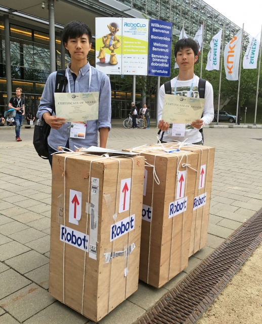 ロボカップ世界大会でベストポスター賞に輝いた加藤君(左)と上沢君=4日、会場のコングレスセンター前 (2016/07/08)