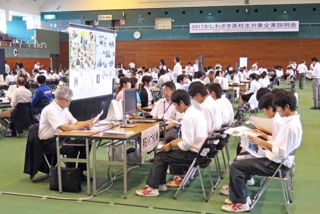 企業説明会で事業所の担当者から説明を受ける高校生=市総合体育館 (2016/07/09)