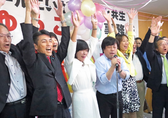 再選を果たし、国会議員や市民グループ代表らと万歳をする森裕子さん(中央)=10日午後11時半過ぎ、新潟市中央区の選挙事務所 (2016/07/11)