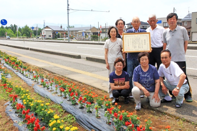国道252号の清掃・花植え活動で国土交通大臣表彰を受けた茨目町内会の人たち (2016/06/23)
