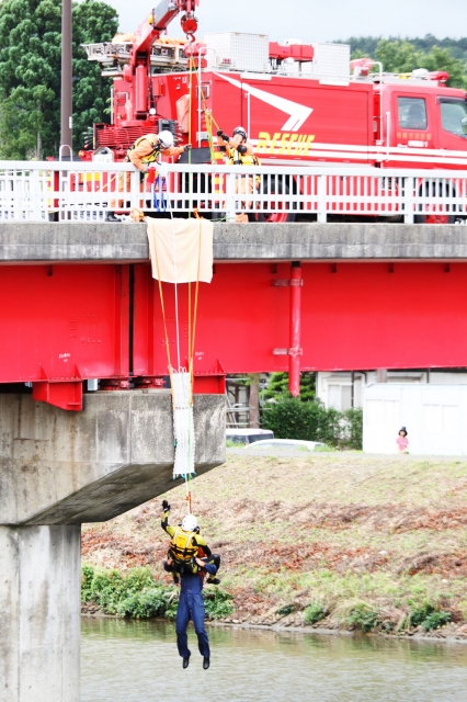 被災者役をロープで橋の上に引き上げる市消防隊員=新金曲輪橋 (2016/06/27)