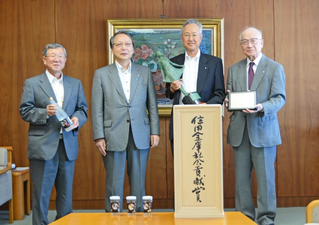 全国最高の「会長賞」を会田市長に報告する小出昭夫・柏崎信金理事長(右から2人目)ら=27日、市役所市長応接室 (2016/06/28)